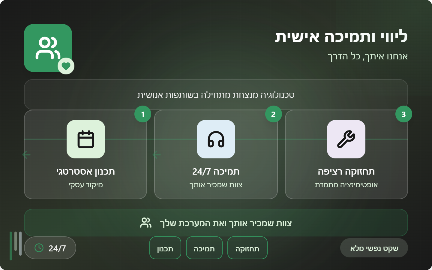 אנחנו מציעים מודל שותפות מלא שמתחיל הרבה לפני עליית האתר וממשיך לאורך כל חיי המערכת שלך: