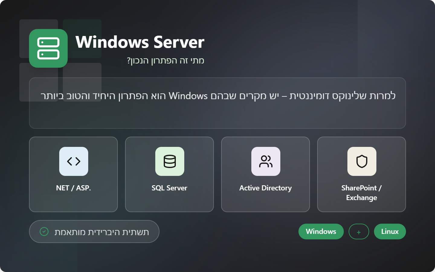 - מסד נתונים MSSQL: למערכות שמשתמשות ב-SQL Server של מיקרוסופט, סביבת Windows Server מציעה אינטגרציה מלאה וביצועים גבוהים יותר מאשר הרצה על לינוקס.